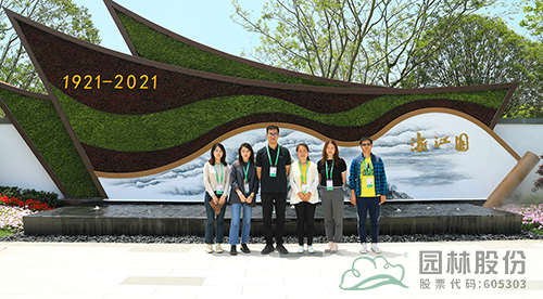 浙江園深化設(shè)計負(fù)責(zé)人高博、花境施工負(fù)責(zé)人張楠等在浙江園入口合影