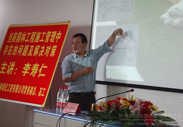 7月4日,應寧波城市職業(yè)技術(shù)學院邀請,杭州市園林綠化工程有限公司常務副總李壽仁在該校舉辦的“第三期園林企業(yè)經(jīng)營管理人才高級研修班”上作“當前園林工程施工管理中存在的問題與解決對策”專題講座,到場聽課的有來自寧波地區(qū)的園林企業(yè)高管、項目經(jīng)理以及在校師生。