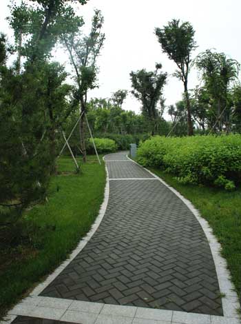而在道路十字路口的節(jié)點處,則主要是用10cm×10cm的小花崗巖鋪地,鋪出來的路面整潔、平坦,看似簡單,實則對施工技術(shù)要求相當(dāng)高。草坪中的地面鋪裝,則采用花崗巖汀步,用錯縫鋪裝法,兩塊花崗巖之間用草皮鑲嵌,就像給每塊花崗巖鑲了一道綠邊,與旁邊的草坪和諧地融為一體。貫穿整個工程的游憩步道,全部采用“人字形”的鋪裝方法,中間用透水磚、兩邊以花崗巖鑲邊,透水磚價格不高,用以鑲邊的花崗巖是利用了鋪裝中剩余的邊料,雖然用料簡單,但通過對技術(shù)的嚴(yán)格要求,鋪出的路面卻整潔而不失韻味,是一種實用、環(huán)保、節(jié)約的做法。