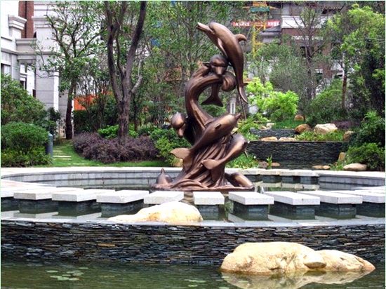 景觀小品是景觀中的點睛之筆,一些造型優(yōu)美的藝術小品,更是讓空間環(huán)境生動起來的關鍵因素。在保利·拉菲,帶有濃郁意大利氣息以及中西文化合璧的景觀小品隨處可見。入口處的歐式水景幕墻利用中國黑、黃銹石燒面、砂巖雕花巧妙結合,形成一幅精美的藝術畫面,幕墻中不斷噴涌的水流激起陣陣白色的漣漪,將后面寫有“保利·拉菲”字跡的景墻襯托得清爽大氣,在陽光照耀下,呈現(xiàn)出流暢、動感的畫面。特別引人注目的是模仿圓明園四大獸首制作的水景雕塑,牛首、豬首、猴首、虎首這四大獸首,形象上采取了西方動物的特征,融合了中國的傳統(tǒng)文化與西方的特色魅力,當細長的水流從四大獸首的口中源源不斷地吐出、落入前方的水池里時,就與從下而上噴出的涌泉形成互動,一上一下、一細一粗,前方再配以色彩絢麗的花草,形成一處動靜相宜、格調(diào)清新的水景。