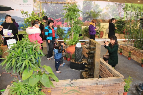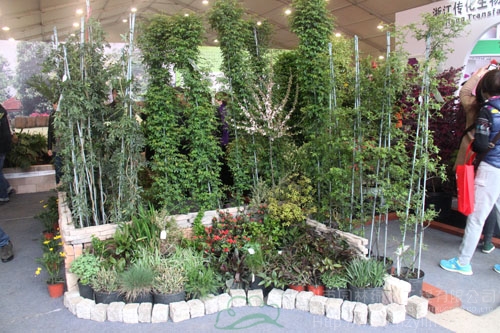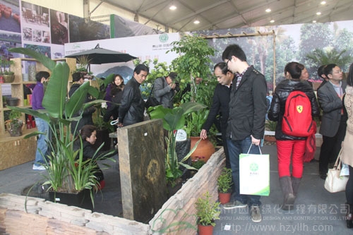 22日上午,浙江(中國)花木城的展廳里人潮涌動,自然的濕地景觀,古樸的庭院,美輪美奐的花境園,超大的“會呼吸”的綠墻……風(fēng)格迥異的情景展示讓人目不暇接。而在展區(qū)的西北角,是一個(gè)綜合型展區(qū):一排排透明的玻璃瓶里展示著研發(fā)中心的組培苗;整齊擺放的穴盤里是生產(chǎn)中心的扦插苗;后面的是運(yùn)營中心造型優(yōu)美的組合盆栽、園藝飾品、盆器等;中間的庭院展示區(qū),低矮的墻角花壇里,一蓬紅艷艷的杜鵑,向人們吐露著春的美麗,生動的流水點(diǎn)綴一旁,引得大人和孩子爭相上前拍照;最里面一個(gè)木平臺上擺放著一套戶外家居,既是采供中心人員的洽談區(qū),也是景觀的一部分。這,就是杭州市園林綠化工程有限公司的展區(qū)。
