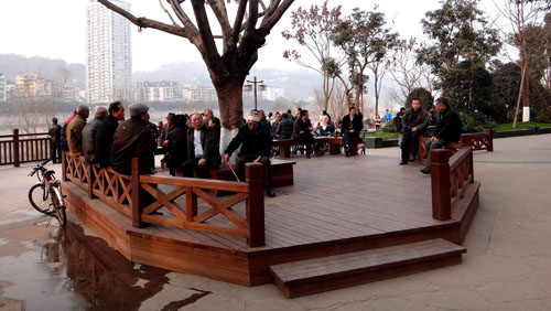 “我們將館驛嘴廣場的設(shè)計(jì)基調(diào)定位為‘奢華’, 是指使用的材料要‘真材實(shí)料’,施工工藝要經(jīng)得起考驗(yàn)?!崩顗廴蔬呑哌吔榻B說,“漣漪廣場上的冰裂紋圖案鋪裝,采用兩種顏色的花崗巖,為了營造出氣泡的效果,特意將圓形的花崗巖用不繡鋼鑲邊,加深色彩,形成對比,從而營造出‘激起漣漪無數(shù)’的奧妙,實(shí)現(xiàn)館驛嘴這艘航船動(dòng)起來的效果,為了保證施工質(zhì)量,工人都是從杭州請來的專業(yè)人員;所有的青石鋪裝,全部采用人工石刻,我們現(xiàn)在看到的這些菠蘿面、荔枝面等紋路,是幾百名能工巧匠一鑿一鑿刻出來的,這種自然、厚重、原生態(tài)的質(zhì)樸美,是機(jī)器切割無法實(shí)現(xiàn)的,更重要的是,大量青石的運(yùn)用,可以有效抵抗洪水的沖刷,就算50年一遇的洪水來襲也不怕;反映瀘州民俗生活的三缺一麻將雕塑,則是用全銅制作,人物形態(tài)惟妙惟肖,紋路雕刻精致細(xì)膩,彰顯出工藝的用心和考究;亭、廊等木結(jié)構(gòu)建筑則采用實(shí)木制作,對木質(zhì)材料和厚度都有嚴(yán)格的要求,達(dá)到美觀與實(shí)用兼顧的要求。”