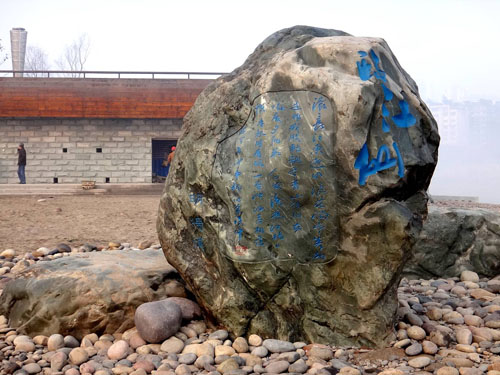 在臨近東門口廣場的地方,豎立著一塊高4米的整石無字碑,粗糙的碑身上下沒有一個(gè)文字,只有鐫刻的一行阿拉伯?dāng)?shù)字“2012.7.23”,以及記錄洪水水位高度的標(biāo)刻?!氨淼捻敳糠幸恢晃┟钗┬さ南?,取名為‘犀牛鎮(zhèn)河妖’,現(xiàn)在犀牛還沒做上去。”李壽仁說,“這塊無字石碑是讓瀘州人民永遠(yuǎn)銘記著2012年7月23日,洪災(zāi)肆虐酒城,洪水水位達(dá)到瀘州歷史最高水位的日子?!币粔K無字碑,勝過千言萬語的表述,卻讓人們銘記一段歷史。作為無字碑的原創(chuàng)者,李壽仁希望借此表達(dá)酒城人民希望今后洪水不再肆虐、家人永遠(yuǎn)平安的祈盼。再仔細(xì)觀察才發(fā)現(xiàn),這塊石碑的四個(gè)角、四個(gè)面的處理方式和紋路都各不相同??此茻o字,實(shí)則意蘊(yùn)深遠(yuǎn),如此創(chuàng)意,讓人暗暗稱妙。