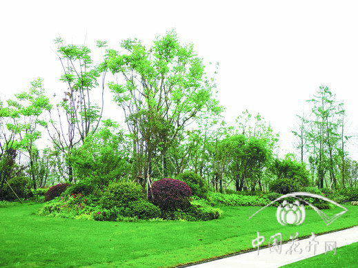 在1號(hào)樓和2號(hào)樓之間,植物配置講究層次錯(cuò)落有致、季相色彩豐富多變、天際線分明起伏、林緣線和草坪線視覺(jué)流暢,遵循大自然本身的多樣性、群落性、生態(tài)性原則,營(yíng)造出對(duì)比強(qiáng)烈、富有節(jié)奏和韻律感的園林景觀。其中,高層主要用榔榆、香樟、櫸樹、落羽杉,中層用桂花、紅楓、雞爪槭、白玉蘭,低層用紅梅、石楠、紅花檵木等,在有限的空間里,營(yíng)造出變化多端的園林景致,特別是大規(guī)格造型植物的應(yīng)用,更是起到了畫龍點(diǎn)睛的作用。
