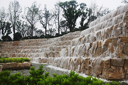 入口水景開闊大氣,行道樹陣整齊劃一。一場(chǎng)歌劇的序曲,不管是澎湃激昂,還是歡快活躍,抑或是柔情舒緩,都將對(duì)整個(gè)局情起著舉足輕重的作用。入口景觀的作用同樣如此,它是整個(gè)園林工程留給人們的第一印象。走進(jìn)項(xiàng)目主入口,寬40米、高10米的寬闊水景,高達(dá)7級(jí)的層階落差,水流層層跌落間,水聲轟鳴,仿佛一道瀑布橫掛眼前。3000平方米的地面鋪裝,全部采用50毫米厚的深灰色和芝麻白花崗巖,走在上面,平坦、踏實(shí)。兩側(cè)的花壇,邊緣鋪設(shè)手法也呈臺(tái)階狀,蘑菇石貼面,花崗巖壓邊,與水景遙相呼應(yīng)?;▔械闹参?,上層選用香樟、銀杏、櫸樹,中層用櫻花、紅葉李,下層用麥冬、水蠟、花石榴及草花,再加上造型樹的點(diǎn)綴,營(yíng)造出群島效果,使得整個(gè)入口景觀莊重典雅,大氣天成。