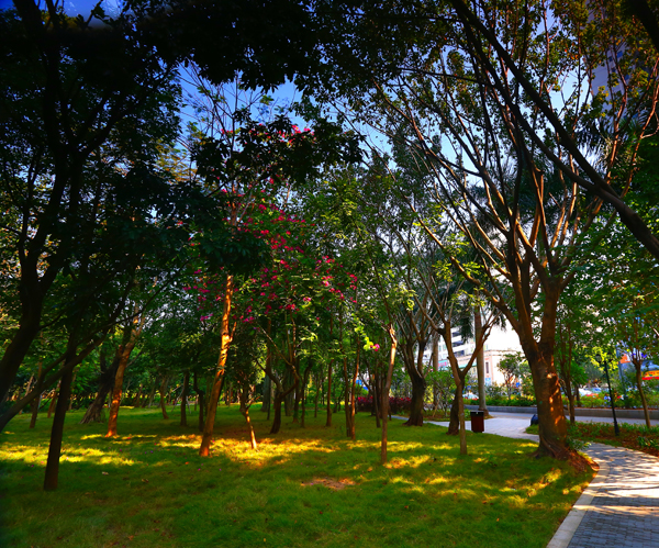 路旁綠地保留了2800多株冠幅茂密的原有喬木,根據(jù)地形又增加了不同規(guī)格的小葉榕、藍花楹、鳳凰木、宮粉紫荊、雞蛋花等喬木,小葉紫薇、丹桂、四季桂、大紅花等灌木,以及勒杜鵑、三色堇、紅車、巴西鳶尾、花葉良姜、巴西野牡丹等地被和草花植物,形成豐富的植物群落。臨近道路的邊緣則片植紅花夾竹桃、紅花羊蹄甲等做背景,下層列植尖葉木犀欖等常綠灌木,形成繁花似錦的熱鬧景觀。