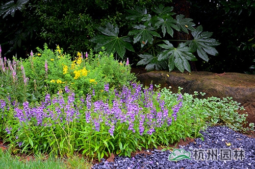 擋墻后采用柳葉馬鞭草+翠蘆莉分帶種植,并點綴穗花牡荊的手法,形成錯落有序、整齊卻不單調的英式鄉(xiāng)村院落景觀。