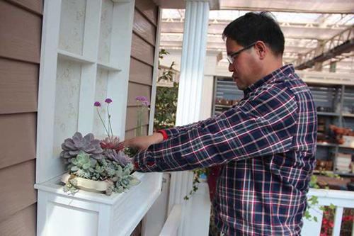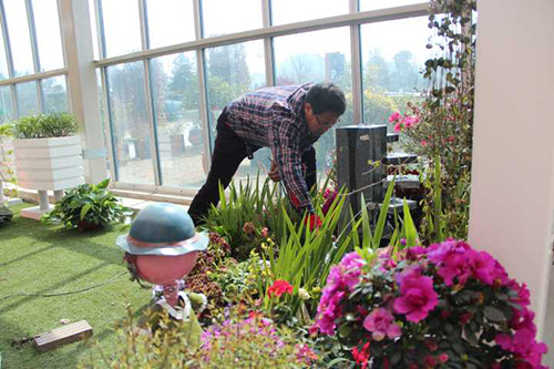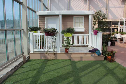 ▲我們選擇園藝中心室內(nèi)一處小木屋的陽臺(tái),作為造景點(diǎn)。園藝師現(xiàn)場查勘后,初步確定花境布置點(diǎn)的面積和風(fēng)格。
