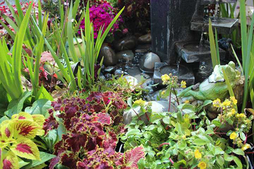 鵝卵石使溪水流淌更趨自然,美麗的鐵藝姑娘在花園中勞作。仔細(xì)看,旁邊還有青蛙王子樂隊(duì)的婉轉(zhuǎn)音樂。這些小細(xì)節(jié),增加了花境的趣味性。