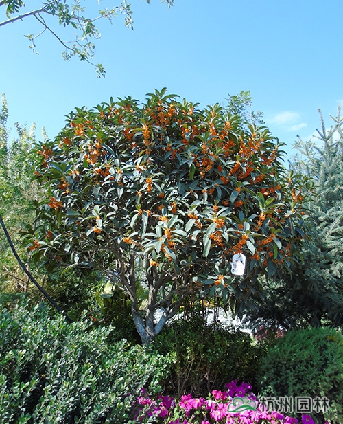 “浙江園”里應(yīng)用的桂花品種以丹桂和銀桂為主,共計(jì)50余棵,包括大喬木和小球類。為保證開(kāi)園期間的觀賞效果,這些桂花被提前運(yùn)送至銀川,利用當(dāng)?shù)氐牡蜏丨h(huán)境誘使其完成花芽分化,終于在九博會(huì)開(kāi)園時(shí)營(yíng)造出了桂花滿樹(shù)、滿園飄香的氛圍。