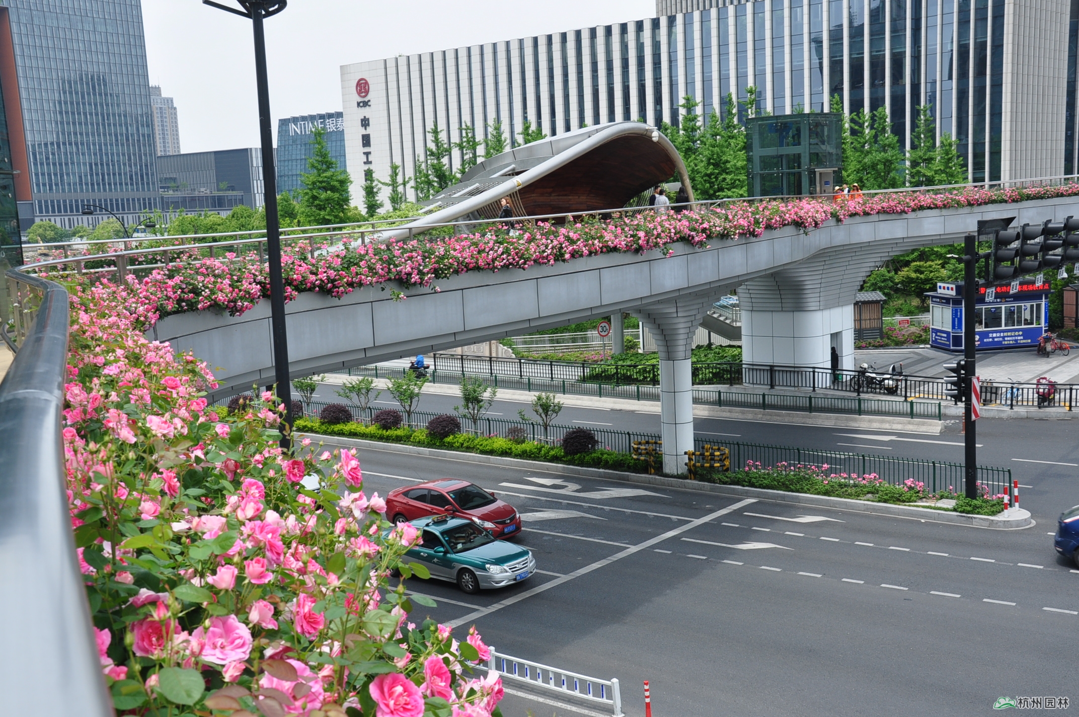 位于新塘路和慶春路交叉口的慶新天橋是新塘路綜合整治工程的標(biāo)志性建筑之一,也是杭州首座仿生態(tài)學(xué)原理的異形人行天橋。橋面獨(dú)特的景觀造型宛如一條風(fēng)景秀美的彩色飄帶,大量月季沿橋面外側(cè)護(hù)欄種植,月季花盛開時(shí)節(jié),橋面仿佛戴上了一條色彩絢麗的花環(huán),美不勝收,充分體現(xiàn)了杭州包容、大氣、開放的時(shí)代風(fēng)貌、都市氣質(zhì)和國(guó)際視野。