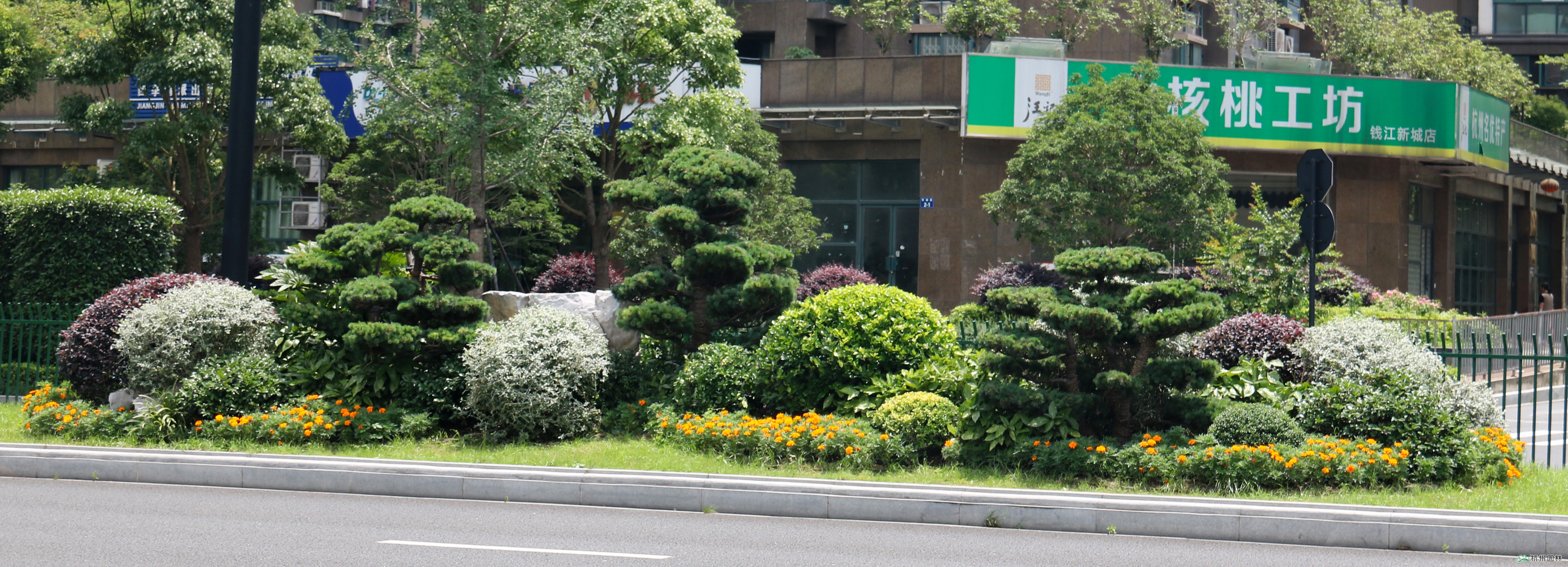 在道路十字路口及一些重要節(jié)點(diǎn),則通過造型樹、球類植物、景石等的有機(jī)結(jié)合,采用盆景化的造園手法,景觀效果獨(dú)具特色。從而使得新塘路成為四季常綠、三季彩葉、全年花開不斷的“最美”迎賓大道。