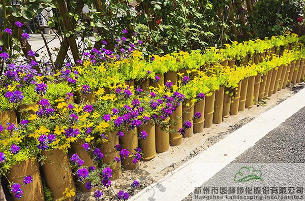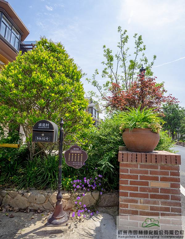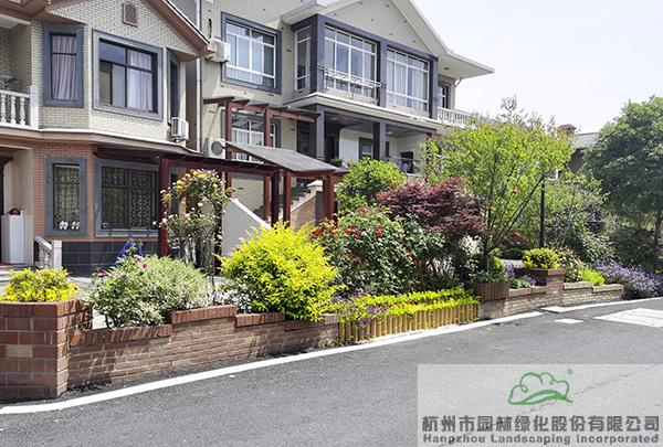 梅秋里的房屋多為兩到三層建筑,但建筑風(fēng)格、外墻立面均有區(qū)別,因此,在進(jìn)行景墻施工時(shí),根據(jù)每家的房屋建筑特色選擇了不同的材料和植物配置手法。比如,建筑外立面為紅色的,景墻以紅色磚為主,搭配月季、佛甲草等植物;建筑外立面為灰色的,景墻以淺黃色磚為主,結(jié)合小木樁或仿竹籬笆,搭配石竹、美女櫻等植物;建筑外立面有大理石點(diǎn)綴的,景墻以桐廬石為主,輔以裝飾過(guò)的輪胎,點(diǎn)綴佛甲草、常春藤等植物。不同的處理手法,使得家家戶(hù)戶(hù)的景墻既有連續(xù)性,又有各自的風(fēng)格。