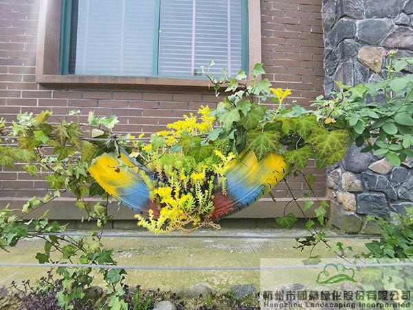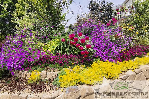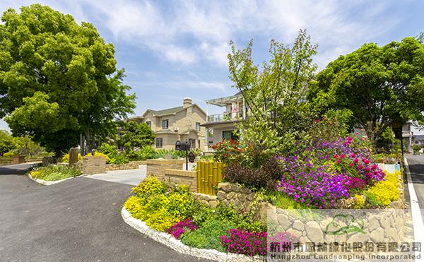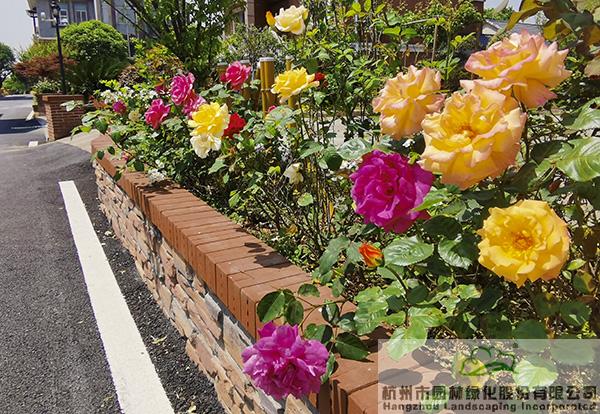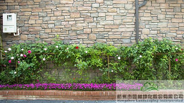 景墻邊的植物配置同樣有講究。利用銀杏、桂花、梅花、紅楓等植物營(yíng)造上層空間,這些植物具有遮擋作用,能夠?yàn)橥ピ籂I(yíng)造一定的私密空間。通過(guò)樹(shù)狀、球狀、攀援、傘狀、字母等各種形態(tài)的月季,金冠女貞球、龜甲冬青球、銀姬小蠟球、藍(lán)莓、八仙花、小葉梔子、翠蘆莉、花葉千鳥(niǎo)花、藍(lán)山鼠尾草、紫葉狼尾草等小喬灌木,在打造中層空間的同時(shí),和美女櫻、金娃娃萱草、花葉玉蟬花、花葉香桃木、紫菀、澤蘭、礬根、五彩絡(luò)石、石竹等下層空間植物一起,裝飾和襯托景墻,使家家戶(hù)戶(hù)的景觀更加豐富多變。