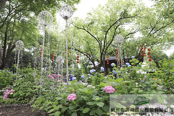 作為本次活動(dòng)的贊助單位,杭州市園林綠化股份有限公司聯(lián)手繡球花產(chǎn)業(yè)國(guó)家創(chuàng)新聯(lián)盟,在城隍閣古樹平臺(tái)布置了《花落花開,年華度》為主題的八仙花景觀展示區(qū),“閣樓觀湖二十年,繡球花燈滿堂前”,通過代表浪漫與愛情之美的繡球花境組團(tuán),結(jié)合錯(cuò)落有致的景觀挑燈和蜿蜒向前的時(shí)間軸序,營(yíng)造出繁花如繡、前程似錦的美好寓意,以此向城隍閣開放20周年獻(xiàn)禮。
