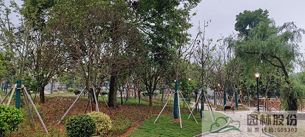公園內(nèi)部增加流線型道路系統(tǒng),以復層式開敞組團進行植物配置,以楓香為主題植物,搭配烏桕、樸樹、櫸樹、柳樹等配景植物,下層種植美人蕉、石蒜、麥冬等,豐富植物層次,營造較為有序且精致的植物景觀,同時設置景石、景觀小品等增加亮點。