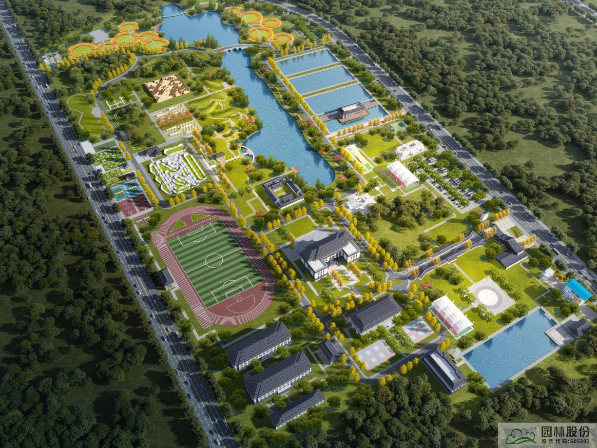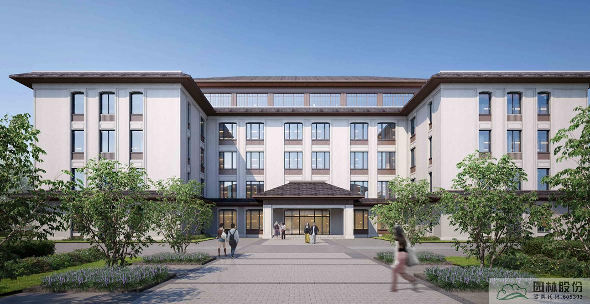 建筑風格以新中式為主,在與朔西湖大景區(qū)的風格相協(xié)調(diào)下,同時兼顧了使用功能。東西向的校園主軸線,從主入口廣場起,經(jīng)整齊的樹陣、升旗臺、至綜合教學樓與綜合服務中心圍合的中心廣場,并向東延伸到宿舍區(qū),是校園中最主要的視廊,大氣、莊重。
