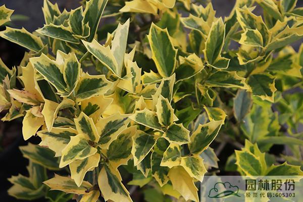 其中,彩葉冬青更是其中的佼佼者。除了果實(shí)可供觀賞外,它們還擁有黃色葉、藍(lán)綠色葉和銀邊葉等彩色葉片。葉形變異也是相當(dāng)豐富,具四角狀,橢圓形,倒卵形等多種形狀;有些品種具有刺狀葉片,而有些則是光滑的葉片;有些品種葉緣還具有波浪狀的起伏。四季景觀分明,在春季,它們的莖腋間會(huì)簇生出一朵朵清新可愛(ài)的小花;而在當(dāng)年生的枝條上,則會(huì)抽出亮麗的嫩葉。到了秋季,隨著氣溫的驟降,葉色會(huì)變得更加地明艷;冬季的時(shí)候,在雌性的植株枝條上,則會(huì)掛滿累累的果實(shí)。這些不同的形態(tài)和色彩變化,使得彩葉冬青在不同的時(shí)間和空間中呈現(xiàn)出不同的姿態(tài)、色彩與意境,從而提升了冬青品種的觀賞價(jià)值,成為園林景觀中重要的觀葉植物。