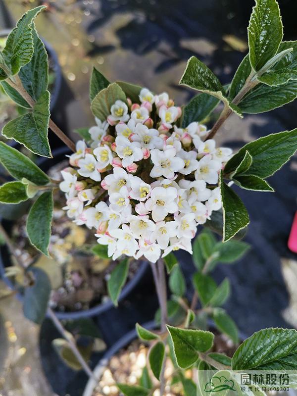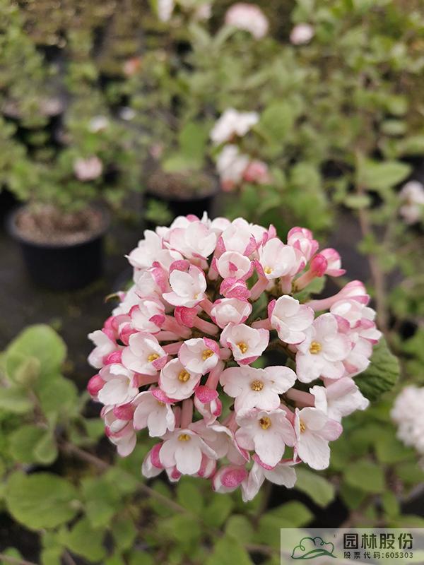 忍冬科莢蒾屬,半常綠或常綠灌木,株高2-3 m,為紅蕾莢蒾和煙管莢蒾的雜交種。葉色深綠,秋季轉(zhuǎn)紅,顏色程度因所處地區(qū)而異。該種繼承了紅蕾莢蒾粉花的優(yōu)良基因,花序未開放時(shí)呈現(xiàn)靚麗的粉色,開放后白色,且具有較濃郁的花香?;◤揭话?.5-10 cm,花期3-4月。植株具有良好的頂端優(yōu)勢(shì),枝條年生長量大,但分枝能力稍弱。幾乎無病蟲害。適應(yīng)性強(qiáng),生長速度快,耐干旱且耐寒,適合自然風(fēng)格的工程應(yīng)用或庭院觀賞。