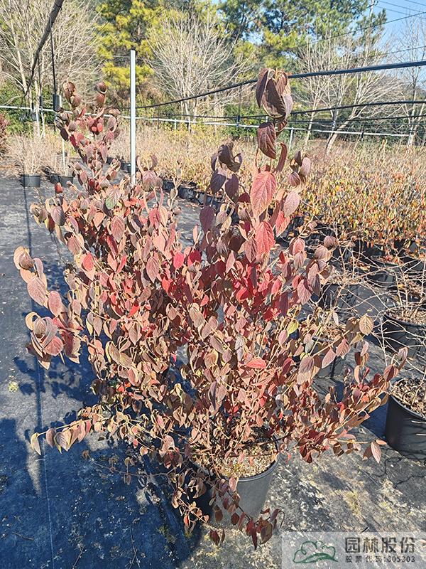 忍冬科莢蒾屬,落葉灌木,全株被毛。花白色,量大,花期4月。果紅色,量通常較小,果期10-12月。秋季葉色變暗紅,通常11月開(kāi)始變色,12月至次年2月達(dá)到最佳觀賞效果。病蟲(chóng)害較少,生長(zhǎng)速度快,且耐寒,通常雪期還未落葉。植株極耐修剪,適合工程應(yīng)用或庭院觀賞。
