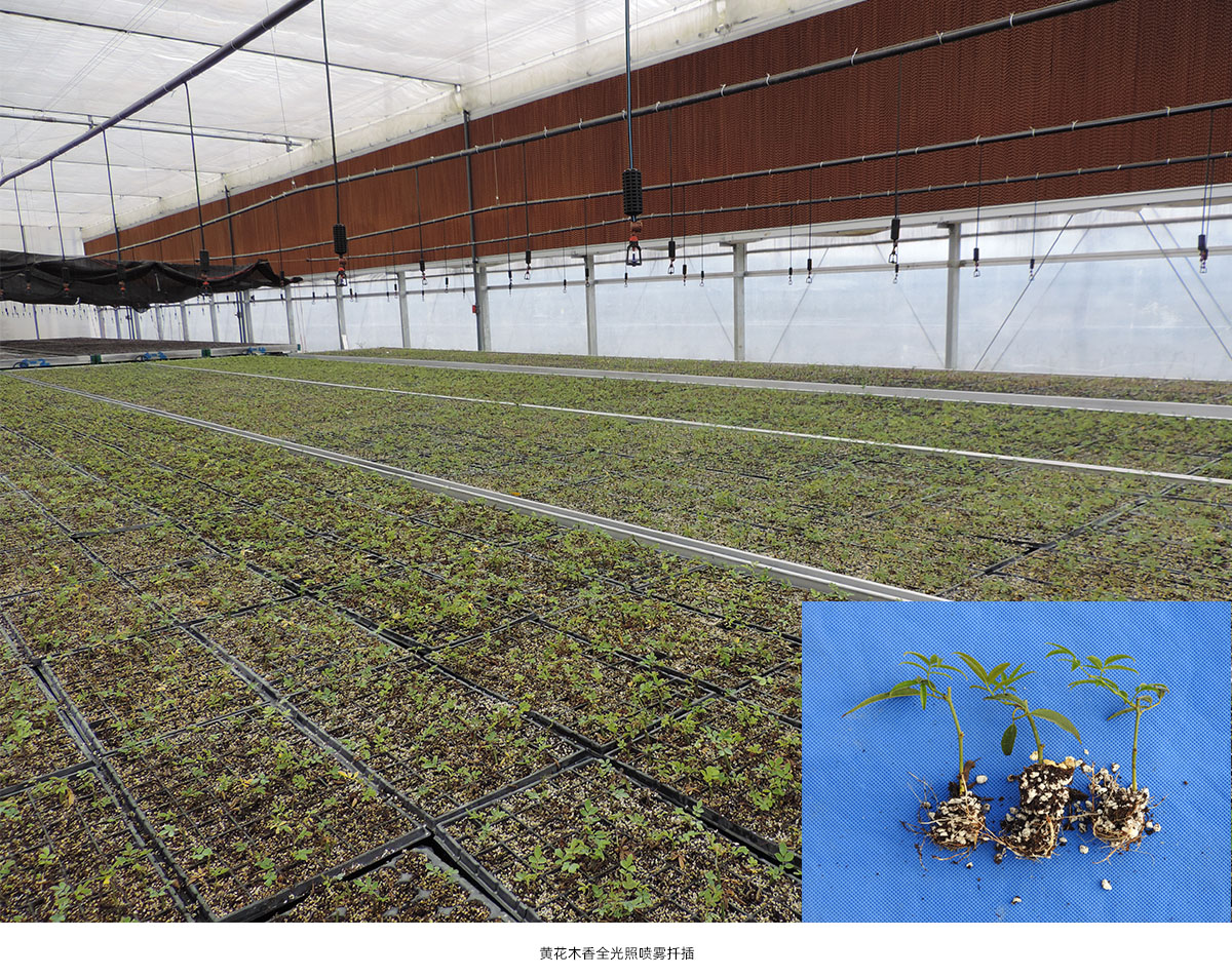 全光照噴霧扦插技術(shù)具有生根期短、成活率高和操作簡單等優(yōu)點(diǎn)。研究院已建立了桂花、冬青、降香黃檀、新優(yōu)宿根植物等數(shù)百種植物的全光照噴霧扦插技術(shù)體系,年度育苗量200多萬。